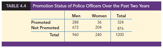 As an illustration of the application of conditional probability, consider the situation of the promotion status of male and female officers of a major metropolitan police force in the eastern United States. The police force consists of 1200 officers, 960 men and 240 women. Over the past two years, 324 officers on the police force received promotions. The specific breakdown of promotions for male and female officers is shown in Table 4.4.