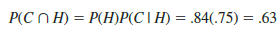 To illustrate the use of the multiplication law, consider a telecommunications company that offers services such as high-speed Internet, cable television, and telephone services. For a particular city, it is known that 84% of the households subscribe to high-speed Internet service. If we let H denote the event that a household subscribes to high-speed Internet service, P(H) = .84. In addition, it is known that the probability that a household that already subscribes to high-speed Internet service also subscribes to cable television service (event C) is .75; that is, P(C I H) = .75. What is the probability that a household subscribes to both high-speed Internet and cable television services? Using the multiplication law, we compute the desired P(C fl H) as