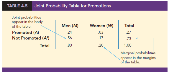 The values in the margins of the joint probability table provide the probabilities of each event separately. That is, P(M) = .80, P(W) = .20, P(A) = .27, and P(Ac) = .73. These probabilities are referred to as marginal probabilities because of their location in the margins of the joint probability table. We note that the marginal probabilities are found by summing the joint probabilities in the corresponding row or column of the joint probability table. For instance, the marginal probability of being promoted is P(A) = P(M ∩ A) + P(W ∩ A) = .24 + .03 = .27. From the marginal probabilities, we see that 80% of the force is male, 20% of the force isfemale, 27% of all officers received promotions, and 73% were not promoted.