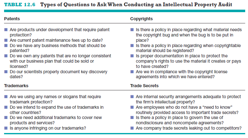There are two primary reasons for conducting an intellectual property audit. First, it is prudent for a company to periodically determine whether its intel- lectual property is being properly protected. As suggested by the contents of Table 12.6, intellectual property resides in every department in a firm, and it is common for firms to simply overlook intellectual property that is eligible for protection.