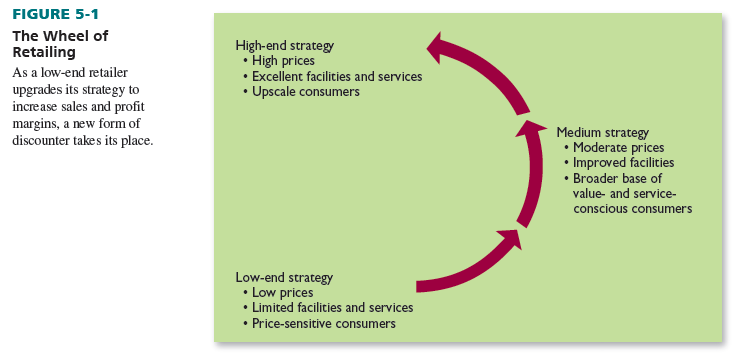 According to the wheel of retailing theory, retail innovators often first appear as low-price operators with low costs and low profit margin requirements. Over time, the innovators upgrade the products they carry and improve their facilities and customer service (by adding better-quality items, locating in higher-rent sites, providing credit and delivery, and so on), and prices rise. As innovators mature, they become vulnerable to new discounters with lower costs—hence, the wheel of retailing.1 See Figure 5-1.