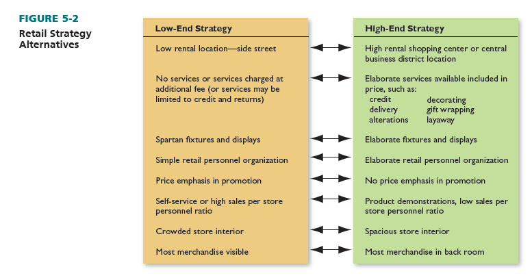 As indicated in Figure 5-1, the wheel of retailing reveals three basic strategic positions: low end, medium, and high end. The medium strategy may have some problems if retailers in this position are not perceived as distinctive. In a mature format such as department stores, competitors at the higher-end and lower-end can steal market share from a middle-of-the-road retailer such as Sears. Its merchandising strategy of selling a vast array of mid-priced goods and services, and a failure to anticipate and react as department stores have diverged into two separate approaches (one at the low end and one at the high end), is threatening its survival as a retailer.2 Figure 5-2 shows the opposing alternatives in considering a strategy mix.