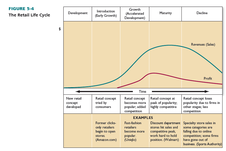 The retail life cycle concept states that retail institutions—like the goods and services they sell— pass through identifiable life stages: introduction (early growth), growth (accelerated development), maturity, and decline. The direction and speed of institutional changes can be interpreted from this concept.3 Take a look at Figure 5-4. The figure shows the five stages of the retail life cycle, with a brief description of each. Examples of each stage are shown at the bottom of the figure.