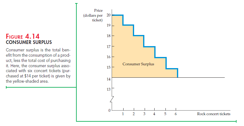 Consumer surplus can be calculated easily if we know the demand curve. To see the relationship between demand and consumer surplus, let’s examine the individual demand curve for concert tickets shown in Figure 4.14. (Although the following discussion applies to this particular individual demand curve, a similar argument also applies to a market demand curve.) Drawing the demand curve as a staircase rather than a straight line shows us how to measure the value that our consumer obtains from buying different numbers of tickets.