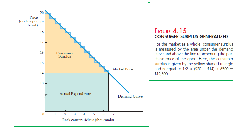 To calculate the aggregate consumer surplus in a market, we sim- ply find the area below the market demand curve and above the price line. For our rock concert example, this principle is illustrated in Figure 4.15. Now, because the number of tickets sold is measured in thousands and individuals’ demand curves differ, the market demand curve appears as a straight line. Note that the actual expenditure on tickets is 6500 X $14 = $91,000. Consumer surplus, shown as the yellow-shaded triangle, is