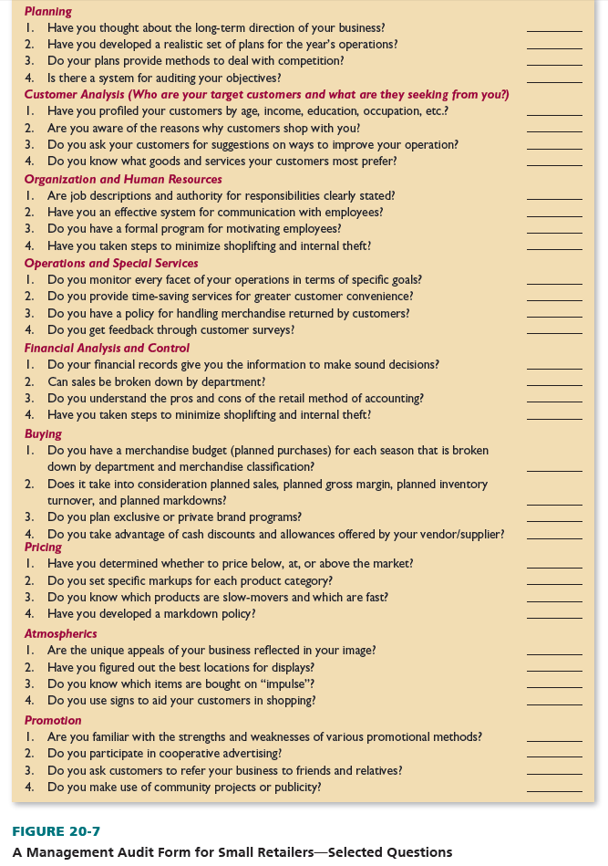A MANAGEMENT AUDIT FORM FOR SMALL RETAILERS Under the auspices of the U.S. Small Business Administration, a Marketing Checklist for Small Retailers was devised. Although written for small firms, it is a comprehensive horizontal audit applicable to all retailers. Figure 20-7 shows selected questions from this audit form. “Yes” is the desired answer to each question. For questions answered negatively, the firm must learn the causes and adjust its strategy.