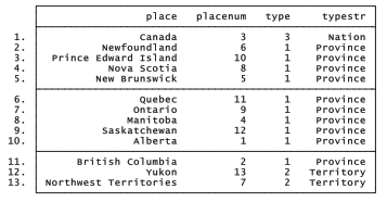Dataset Canada2.dta contains one string variable, place. It also has a labeled categorical variable, type. Both seem to have nonnumeric values.
