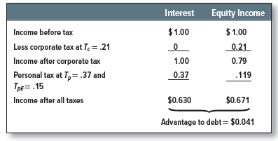 The firm’s capital structure determines whether operating income is paid out as interest or equity income. Interest is taxed only at the personal level. Equity income is taxed at both the corporate and the personal levels. However, TpE, the personal tax rate on equity income, can be less than Tp, the personal tax rate on interest income.