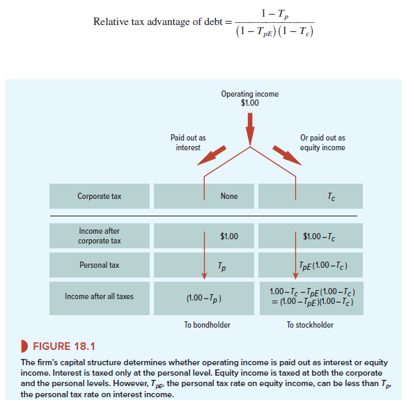 Figure 18.1 illustrates how corporate and personal taxes are affected by leverage. Depending on the firm’s capital structure, a dollar of operating income will accrue to investors either as debt interest or equity income (dividends or capital gains). That is, the dollar can go down either branch of Figure 18.1.