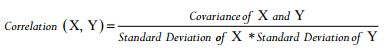 Following our same example from the covariance discussion, let’s now determine the cor- relation of number of ads placed in a week and a business’s total sales. The formula for calcu- lating a correlation coefficient is a little more straightforward than the covariance formula.To calculate a correlation, you use the following formula: