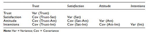 To calculate the observed covariance matrix, you would assess the variance for each vari- able and then determine the covariance for each possible variable combination. Here is an example of how the observed covariance matrix would be calculated with our four variable model.