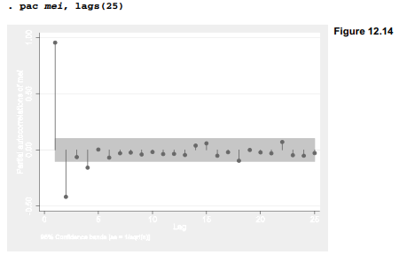 A similar command, pac, produces the graph of partial autocorrelations in Figure 12.14. Approximate confidence intervals are based on standard error estimates of 1/v’rT . The partial autocorrelations of mei, unlike the autocorrelations, cut offto mostly nonsignificant values after a 2-month lag.