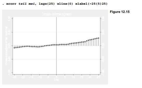 The resulting correlogram, Figure 12.13, includes a shaded area marking pointwise 95% confidence intervals. Correlations outside of these intervals are individually significant. The lags(25) option extends this graph to a 25-month lag, revealing that autocorrelations of mei become negative after about 12 months. This pattern reflects the quasi-oscillatory character of ENSO: high periods have some tendency to be followed by low ones, and vice versa.