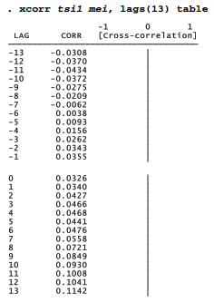 The actual cross-correlation coefficients, and a text version of the cross-correlogram, can be obtained with the table option: