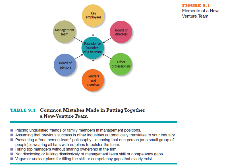 The elements of a new-venture team are shown in Figure 9.1. It’s important to carefully think through each element. Miscues regarding whether team mem- bers are compatible, whether the team is properly balanced in terms of areas of expertise, and how the permanent members of the team will physically work together can be fatal. Conversely, careful attention in each of these areas can help a firm get off to a good start and provide it an advantage over competitors.