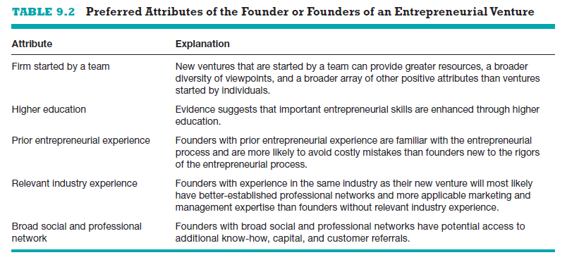 Table 9.2 shows the preferred attributes of a firm’s founder or founders. Start-ups that have founders or a team of founders with these attributes have the best chances of early success. If an individual is starting a company and is looking for a co-founder, there are several websites dedicated to matchmak- ing co-founders for start-ups. Two of the best sites are CofoundersLab (www. cofounderslab.com) and Founder2Be (www.founder2be.com).