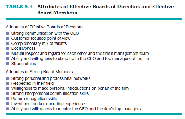 If a new venture organizes as a corporation, it is legally required to have a board of directors—a panel of individuals who are elected by a corporation’s shareholders to oversee the management of the firm.25 A board is typically made up of both inside and outside directors. An inside director is a person who is also an officer of the firm. An outside director is someone who is not employed by the firm. A board of directors has three formal responsibilities: (1) appoint the firm’s officers (the key managers), (2) declare dividends, and (3) oversee the affairs of the corporation. In the wake of corporate scandals such as Enron, WorldCom, and others, there is a strong emphasis on the board’s role in making sure the firm is operating ethically. One outcome of this move- ment is a trend toward putting more outsiders on boards of directors, because people who do not work for the firm are usually more willing to scrutinize the behavior of management than insiders who work for the company. Most boards meet formally three or four times a year. Large firms pay their directors for their service. New ventures are more likely to pay their directors in company stock or ask them to serve without direct compensation—at least until the company is profitable. The boards for publicly traded companies are required by law to have audit and compensation committees. Many boards also have nominating committees to select stockholders to run for vacant board positions. A list of the most desirable qualities in a board of directors and the most desirable qualities in individual board members is provided in Table 9.4.