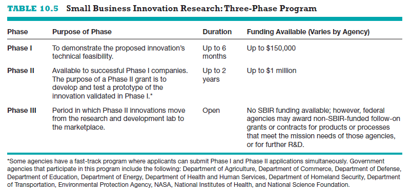 The SBIR Program is a competitive grant program that provides over $2.5 billion per year to small businesses for early-stage and development proj- ects. Each year, 11 federal departments and agencies are required by the SBIR to reserve a portion of their research and development funds for awards to small businesses. Table 10.5 shows the agencies that participate, along with the types of areas that are funded. Guidelines for how to apply for the grants are provided on each agency’s website, along with a description of the types of projects the agencies are interested in supporting. The SBIR is a three-phase program, meaning that firms that qualify have the potential to receive more than one grant to fund a particular proposal. These three phases, along with the amount of funding available for each phase, are as follows: