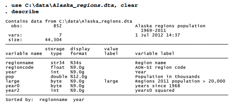 This section applies xtmixed to a different kind of multilevel data: cross-sectional time series. Dataset Alaskaregions.dta contains time series of population for each of the 27 boroughs, municipalities or census areas that together make up the state of Alaska. These 27 regions are a fragment from the pan-Arctic human-dimensions database framework described by Hamilton and Lammers (2011). In Alaska regions.dta, a dummy variable named large marks the five most populous Alaska regions, those having 2011 populations greater than 20,000. The other 22 regions are predominantly rural, and their smaller populations might be widely dispersed. The Northwest Arctic borough, for example, covers a geographic area larger than the state of Maine, but had a 2011 population of fewer than 8,000 people. For each of the 27 regions there are multiple years of data, ranging from 1969 to 2011 but with many missing values. Thus, for each variable there are 27 parallel but often incomplete time series.