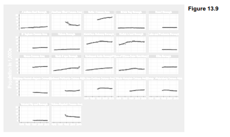 A more substantive analysis using mixed-effects regression to model relationships involving multiple time series appears in a paper on population, climate and electricity use in towns and villages of Arctic Alaska (Hamilton et al. 2011). Dataset Alaska_places.dta contains the core data for this analysis, consisting of annual time series for each of 42 towns and villages in Arctic Alaska, all within five of the census regions or boroughs graphed in Figure 13.9 above. Variables include community population, kilowatt hours of electricity sold, the average rate charged for electricity (in constant 2009 dollars), and estimates of the summer temperature and precipitation around that location each year. The paper supplies information about variable definitions, data sources and the context for this analysis.