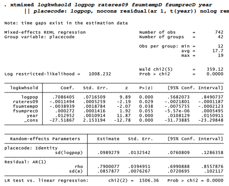 The mixed-effect analysis below models the kilowatt hours of electricity sold in each community, each year, as a function of population, electricity rate in constant 2009 dollars, summer temperature and precipitation, and year. The model includes random effects for population, and first-order autoregressive errors. Reasoning behind this particular specification, and tests for the robustness of modeling results, are given in the paper; the short presentation here just aims to show what such an analysis looks like.