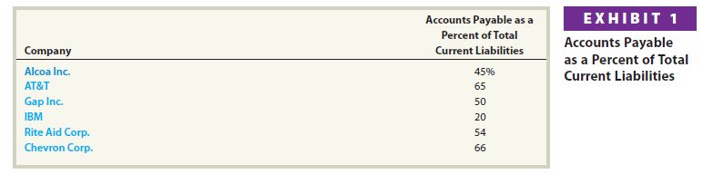 Accounts payable transactions have been described and illustrated in earlier chapters. These transactions involved a variety of purchases on account, including the purchase of merchandise and supplies. For most companies, accounts payable is the largest current liability. Exhibit 1 shows the accounts payable balance as a percent of total current liabilities for a number of companies.