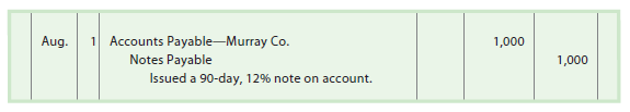 To illustrate, assume that Nature’s Sunshine Company issued a 90-day, 12% note for $1,000, dated August 1, 2013, to Murray Co. for a $1,000 overdue account. The entry to record the issuance of the note is as follows:
