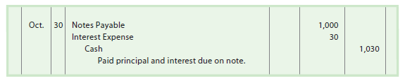 When the note matures, the entry to record the payment of $1,000 plus $30 interest ($1,000 x 12% x 90/360) is as follows: