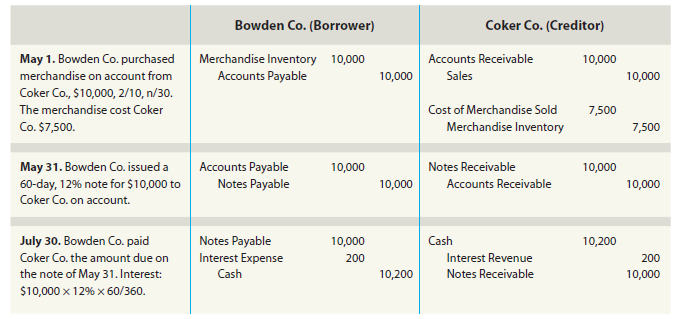 Each note transaction affects a debtor (borrower) and creditor (lender). The following illustration shows how the same transactions are recorded by the debtor and creditor. In this illustration, the debtor (borrower) is Bowden Co., and the creditor (lender) is Coker Co.