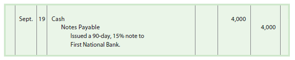 A company may also borrow from a bank by issuing a note. To illustrate, assume that on September 19 Iceburg Company borrowed cash from First National Bank by issuing a $4,000, 90-day, 15% note to the bank. The entry to record the issuance of the note and the cash proceeds is as follows: