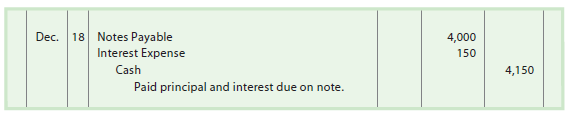 On the due date of the note (December 18), Iceburg Company owes First National Bank $4,000 plus interest of $150 ($4,000 x 15% x 90/360). The entry to record the payment of the note is as follows:
