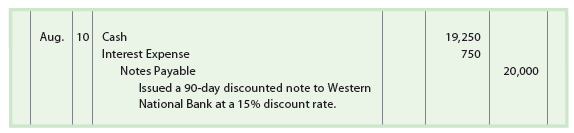 To illustrate, assume that on August 10, Cary Company issues a $20,000, 90-day discounted note to Western National Bank. The discount rate is 15%, and the amount of the discount is $750 ($20,000 x 15% x 90/360). Thus, the proceeds received by Cary Company are $19,250. The entry by Cary Company is as follows: