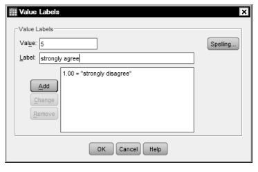 - Type 5 and strongly agree in the Values and Value Labels Your window should look like Fig. 2.6 just before you click on Add for the second time.