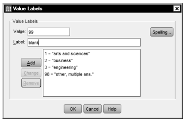 - Then click Add. Do the same for 2 = business, 3 = engineering, 98 = other, multiple ans., 99 = blank.