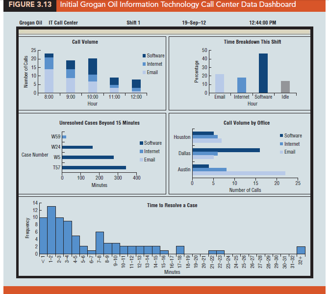 Dashboards such as the Grogan Oil data dashboard are often interactive. For instance, when a manager uses a mouse or a touch screen monitor to position the cursor over the display or point to something on the display, additional information, such as the time to resolve the problem, the time the call was received, and the individual and/or the location that reported the problem, may appear. Clicking on the individual item may also take the user to a new level of analysis at the individual case level.