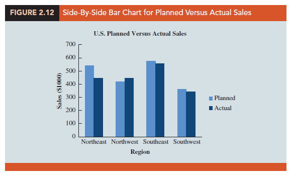 Figure 2.12 shows a side-by-side bar chart of the planned versus actual sales data. Note how this bar chart makes it very easy to compare the planned versus actual sales in a region, as well as across regions. This graphical display is simple, contains a title, is well labeled, and uses distinct colors to represent the two types of sales. Note also that the scale of the vertical axis begins at zero. The four sales regions are separated by space so that it is clear that they are distinct, whereas the planned versus actual sales values are side-by-side for easy comparison within each region. The side-by-side bar chart in Figure 2.12 makes it easy to see that the Southwest region is the lowest in both planned and actual sales and that the Northwest region slightly exceeded its planned sales.