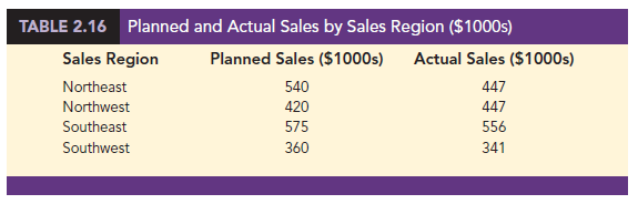 The data presented in Table 2.16 show the forecasted or planned value of sales ($1000s) and the actual value of sales ($1000s) by sales region in the United States for Gustin Chemical for the past year. Note that there are two quantitative variables (planned sales and actual sales) and one categorical variable (sales region). Suppose we would like to develop a graphical display that would enable management of Gustin Chemical to visualize how each sales region did relative to planned sales and simultaneously enable management to visualize sales performance across regions.
