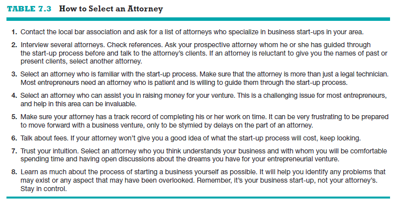It is important for an entrepreneur to select an attorney as early as possible when developing a business venture. Selecting an attorney was instrumental in helping Tempered Mind, the company profiled in the opening feature, estab- lish a firm legal foundation. Table 7.3 provides guidelines to consider when se- lecting an attorney. It is critically important that the attorney be familiar with start-up issues and that he or she has successfully shepherded entrepreneurs through the start-up process before. It is not wise to select an attorney just because she is a friend or because you were pleased with the way she prepared your will. For issues dealing with intellectual property protection, it is essential to use an attorney who specializes in this field; such as a patent attorney when filing a patent application.9