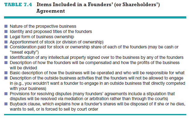 If two or more people start a business, it is important that they have a found- ers’ (or shareholders’) agreement. A founders’ agreement is a written docu- ment that deals with issues such as the relative split of the equity among the founders of the firm, how individual founders will be compensated for the cash or the “sweat equity” they put into the firm, and how long the founders will have to remain with the firm for their shares to fully vest.10