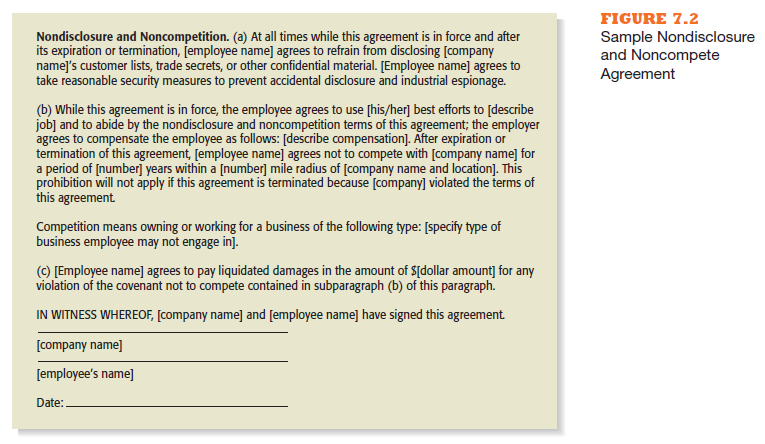 There are also two important written agreements that the majority of firms ask their employees to sign. A nondisclosure agreement binds an employee or another party (such as a supplier) to not disclose a company’s trade secrets. A noncompete agreement prevents an individual from competing against a former employer for a specific period of time. A sample nondisclosure and non- compete agreement is shown in Figure 7.2.