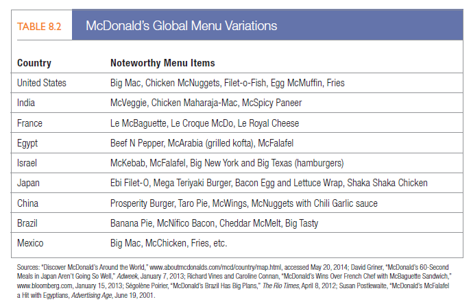 Take McDonald’s, for example.64 It allows countries and regions to customize its basic layout and menu staples (see Table 8.2). In cities plagued by traffic tie-ups like Manila, Taipei, Jakarta, and Cairo, McDonald’s delivers via fleets of motor scooters.