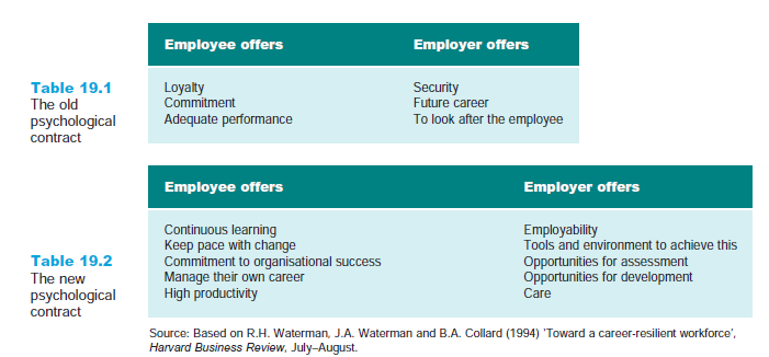 If the psychological contract between employer and employee now needs to be renegotiated, this does not mean abandoning the concept of career, rather, the idea of a new psychological contract is developing. Many articles identify a ‘new psychological contract’ in which the deal between employer and staff is different but still mutually beneficial. Employees offer high productivity and total commitment while with their employer, and the employer offers enhanced employability rather than long-term employment. The offer of employability centres on enabling employees to develop skills that are in demand, and allows them opportunities to practise these and keep up to date. This equips the employee with the skills and experiences needed to obtain another appropriate job when he or she is no longer needed by their present employer (see, for example, Waterman et al. 1994). The differences between the old psychological contract and the new, as they relate to careers, are shown in Tables 19.1 and 19.2. King (2003) found that graduates rated the offer of employability as of most importance in career terms, and they still expected the organisation to provide a career for them; she argues that the picture presented is one of lip service and a less than whole-hearted commitment to the concept of the ‘new career’.