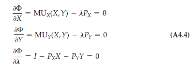 In general, the three equations in (A4.4) can be solved to determine the three unknowns X, Y, and X as a function of the two prices and income. Substitution for X then allows us to solve for the demand for each of the two goods in terms of income and the prices of the two commodities. This principle can be most easily seen in terms of an example.