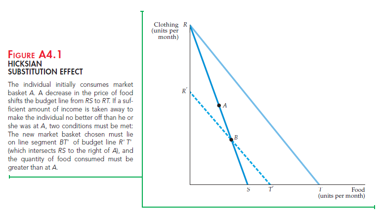 An alternative way to decompose a price change into sustitution and income effects, which is usually attributed to John Hicks, does not involve indifference curves. In Figure A4.1, the consumer initially chooses market basket A on budget line RS. Suppose that after the price of food falls (and the budget line moves to RT), we take away enough income so that the individual is no better off (and no worse off) than he was before. To do so, we draw a budget line parallel to RT. If the budget line passed through A, the consumer would be at least as satisfied as he was before the price change: He still has the option to purchase market basket A if he wishes. According to the Hicksian substitution effect, therefore, the budget line that leaves him equally well off must be a line such as R’T’, which is parallel to RT and which intersects RS at a point B below and to the right of point A.