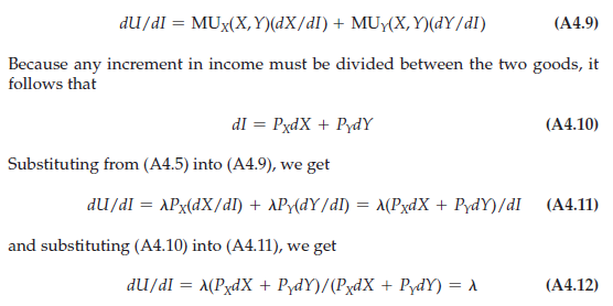 Whatever the form of the utility function, the Lagrange multiplier X represents the extra utility generated when the budget constraint is relaxed—in this case by adding one dollar to the budget. To show how the principle works, we differentiate the utility function U(X, Y) totally with respect to I: