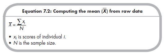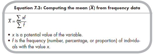 Occasionally, however, the primary studies will report frequency tables rather than means for variables with a small number of potential options. For example, a primary study might report the number or proportion of individuals scoring 0, the number or proportion scoring 1, and so on, on a measure that has possible options of 0, 1, 2, 3, and 4. Here, you can use these frequencies of different scores to re-create the raw data and then compute the mean from these data (using Equation 7.2). An easier way to compute this mean is using the following equivalent formula provided by Lipsey and Wilson (2001, p. 176), summing over all potential values of a variable: