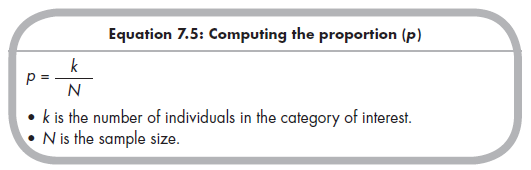 Whereas the mean is a useful effect size for the typical score (i.e., central tendency) of a single continuous variable, the proportion is a useful effect size for a particular category of a categorical variable. For example, we may be interested in the proportion of children who are aggressive or the proportion of individuals who meet certain criteria for rejected social status, if we believe the meaningful conceptualization of aggression or rejection is categorical. In these cases, we are interested in the prevalence of an affirmative instance of a single dichotomous variable.2
