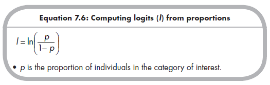 This proportion works well as an effect size in many situations, but is problematic when proportions are far from 0.50.3 For this reason, it is useful to transform proportions (p) into logits (l) prior to meta-analytic combination or comparison: