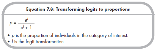 Analyses would then be performed on the logit (l), weighted by the standard error (SEj) as described in Chapters 8 through 10. For reporting, it is useful to back-transform results (e.g., mean effect size) in logits (l) back to proportions (p), using the following equation: