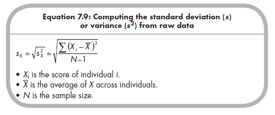 This equation is the unbiased estimate of population standard deviation (and the square root of variance) from a sample (versus a description of the sample variability, which would be computed using N rather than N – 1 in the denominator). This is also the statistic commonly reported in primary research. In fact, you will almost never need to calculate this standard deviation, as doing so requires raw data that are typically not available. Fortu-nately, standard deviations (or variances) are nearly always reported as basic descriptive information in primary studies.4